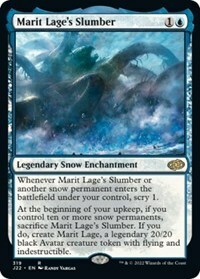 At the beginning of your upkeep, if you control ten or more snow permanents, sacrifice Marit Lage’s Slumber. If you do, create Marit Lage, a legendary 20/20 black Avatar creature token with flying and indestructible.