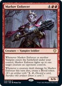 Whenever Markov Enforcer or another Vampire enters the battlefield under your control, Markov Enforcer fights up to one target creature an opponent controls.
