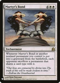 Whenever Martyr's Bond or another nonland permanent you control is put into a graveyard from the battlefield, each opponent sacrifices a permanent that shares a card type with it.