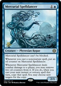 Whenever Mercurial Spelldancer deals combat damage to a player, you may remove two oil counters from it. If you do, when you cast your next instant or sorcery spell this turn, copy that spell. You may choose new targets for the copy.