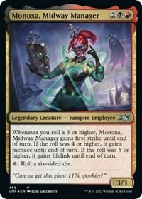 Whenever you roll a 3 or higher, Monoxa, Midway Manager gains first strike until end of turn. If the roll was 4 or higher, it gains menace until end of turn. If the roll was 5 or higher, it gains lifelink until end of turn.