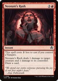 Neonate's Rush deals 1 damage to target creature and 1 damage to its controller. Draw a card.
