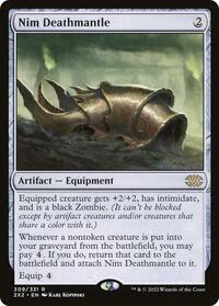 Whenever a nontoken creature is put into your graveyard from the battlefield, you may pay 4. If you do, return that card to the battlefield and attach Nim Deathmantle to it.