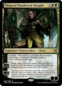 Landfall — Whenever a land enters the battlefield under your control, put a loyalty counter on Nissa of Shadowed Boughs.