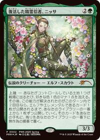 Landfall — Whenever a land you control enters, add one mana of any color. Then if this is the second time this ability has resolved this turn, reveal cards from the top of your library until you reveal an Elf or Elemental card. Put that card into your hand and the rest on the bottom of your library in a random order.