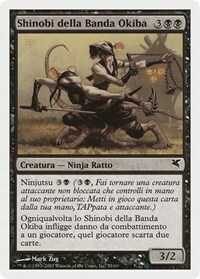 Whenever Okiba-Gang Shinobi deals combat damage to a player, that player discards two cards.