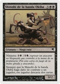 Whenever Okiba-Gang Shinobi deals combat damage to a player, that player discards two cards.