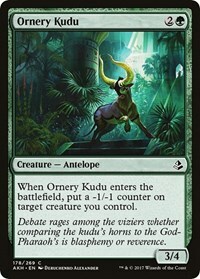 When Onery Kudu enters the battlefield, put a -1/-1 counter on target creature you control.