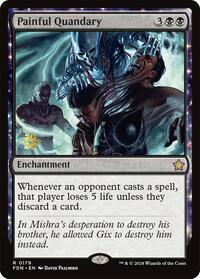 Whenever an opponent casts a spell, that player loses 5 life unless they discard a card.