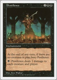 At the end of any turn, if there are no creatures in play, bury Pestilence.