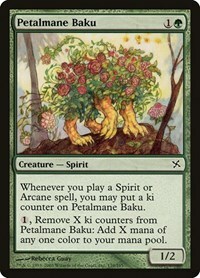 Whenever you play a Spirit or Arcane spell, you may put a ki counter on Petalmane Baku.