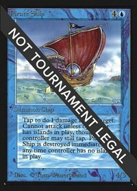 Tap to do 1 damage to any target. Cannot attack unless opponent has islands in play, though controller may still tap. Pirate Ship is destroyed immediately if at any time controller has no islands in play.