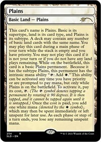 This card's name is Plains. Basic is its supertype, land is its card type, and Plains is its subtype. A deck may contain any number of basic land cards with the same name. You may play this card during a main phase of your turn while the stack is empty and you have priority. You may not play this card if it is not your turn or if you do not have any land plays remaining. while on the battlefield, this card is a basic Plains permanent. Because it has the subtype Plains, this permanent has the intrinsic mana ability "T: Add W." This ability can be activated any time you have priority or are prompted to pay mana, but only white Plains is on the battlefield. To activate it, pay its cost, T. (The T symbol denotes tapping a permanent by rotating it 90 degrees. it is then tapped, and it cannot be tapped again until it is untapped.) Once the cost is paid, you add one white mana , which may then be spend immediately or left unspent for later use. As each phrase or step of a turn ends, you lose any remaining unspent mana.