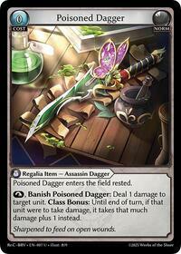 REST, Banish Poisoned Dagger: Deal 1 damage to target unit. Class Bonus: Until end of turn, if that unit were to take damage, it takes that much damage plus 1 instead.