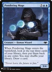 When Pondering Mage enters the battlefield, look at the top three cards of your library, then put them back in any order. You may shuffle your library. Draw a card.