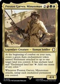Whenever Preston Garvey, Minuteman attacks, untap each enchanted permanent you control.