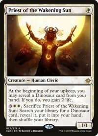 3WW, Sacrifice Priest of the Wakening Sun: Search your library for a Dinosaur card, reveal it, put it into your hand, then shuffle your library.