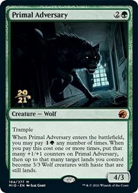 When Primal Adversary enters the battlefield, you may pay 1G any number of times. When you pay this cost one or more times, put that many +1/+1 counters on Primal Adversary, then up to that many target lands you control become 3/3 Wolf creatures with haste that are still lands.