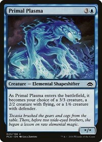 As Primal Plasma enters the battlefield, it becomes your choice of a 3/3 creature, a 2/2 creature with flying, or a 1/6 creature with defender.