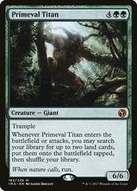 Whenever Primeval Titan enters the battlefield or attacks, you may search your library for up to two land cards, put them onto the battlefield tapped, then shuffle your library.