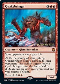 At the beginning of your upkeep, Quakebringer deals 2 damage to each opponent. This ability triggers only if Quakebringer is on the battlefield or if Quakebringer is in your graveyard and you control a Giant.