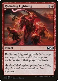 Radiating Lightning deals 3 damage to target player and 1 damage to each creature that player controls.