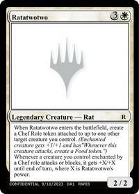 When Ratatwotwo enters the battlefield, create a Chef Role token attached to up to one other target creature you control. (Enchanted creature gets +1/+1 and has “Whenever this creature attacks, create a Food token.”)