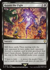 Mill three cards. Then starting with the next opponent in turn order, each opponent chooses a creature card in your graveyard that hasn't been chosen. Return each card chosen this way to the battlefield under your control.