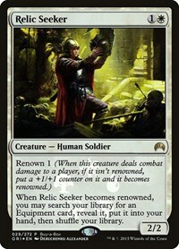 When Relic Hunter becomes renowned, you may search your library for an Equipment card, reveal it, and put it into your hand, then shuffle your library.