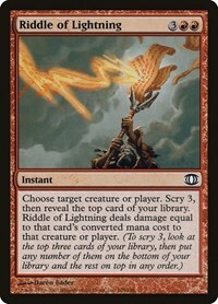 Choose target creature or player. Scry 3, then reveal the top card of your library. Riddle of Lightning deals damage equal to that card's converted mana cost to that creature or player. (To scry 3, look at the top three cards of your library, then put any number of them on the bottom of your library and the rest on top in any order.)