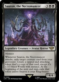 Whenever Sauron, the Necromancer attacks, exile target creature card from your graveyard. Create a tapped and attacking token that's a copy of that card, except it's a 3/3 black Wraith with menace. At the beginning of the next end step, exile that token unless Sauron is your Ring-bearer.