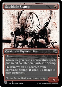 Whenever you cast a noncreature spell, put an oil counter on Sawblade Scamp.