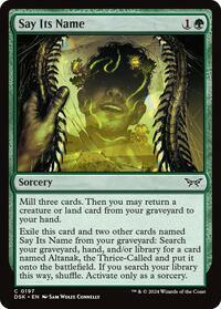 Exile this card and two other cards named Say Its Name from your graveyard: Search your graveyard, hand, and/or library for a card named Altanak, the Thrice-Called and put it onto the battlefield. If you search your library this way, shuffle. Activate only as a sorcery.