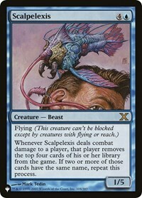Whenever Scalpelexis deals combat damage to a player, that player removes the top four cards of his or her library from the game. If two or more of those cards have the same name, repeat this process.