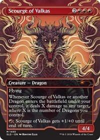 Whenever Scourge of Valkas or another Dragon enters the battlefield under your control, it deals X damage to any target, where X is the number of Dragons you control.