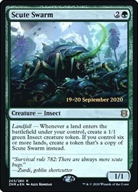 Landfall — Whenever a land enters the battlefield under your control, create a 1/1 green Insect creature token. If you control six or more lands, create a token that’s a copy of Scute Swarm instead.