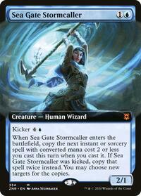 When Sea Gate Stormcaller enters the battlefield, copy the next instant or sorcery spell with converted mana cost 2 or less you cast this turn when you cast it. If Sea Gate Stormcaller was kicked, copy that spell twice instead. You may choose new targets for the copies.