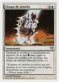 Destroy target artifact or enchantment. If G was spent to play Seed Spark, put two 1/1 green Saproling creature tokens into play.