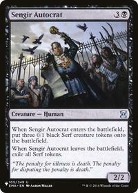 When Sengir Autocrat enters the battlefield, put three 0/1 black Serf creature tokens onto the battlefield.