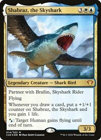 Whenever you draw a card, put a +1/+1 counter on Shabraz, the Skyshark and you gain 1 life.