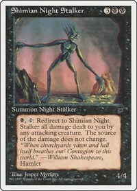 B, T: Redirect to Shimian Night Stalker all damage dealt to you by any attacking creature. The source of the damage does not change.