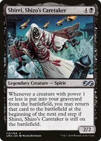 Whenever a creature with power 1 or less is put into your graveyard from the battlefield, you may return that card to the battlefield at the beginning of the next end step if Shirei, Shizo's Caretaker is still on the battlefield.