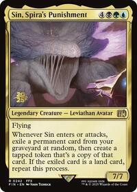 Whenever Sin enters or attacks, exile a permanent card from your graveyard at random, then create a tapped token that's a copy of that card. If the exiled card is a land card, repeat this process.