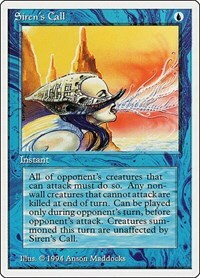 All of opponent’s creatures that can attack must do so. Any non-wall creatures that cannot attack are killed at end of turn. Can be played only during opponent’s turn, before opponent’s attack. Creatures summoned this turn are unaffected by Siren’s Call.