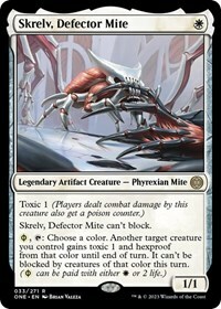WP, T: Choose a color. Another target creature you control gains toxic 1 and hexproof from that color until end of turn. It can't be blocked by creatures of that color this turn. (WP can be paid with either