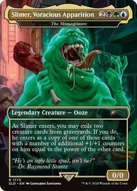 As Slimer enters the battlefield, you may exile two creature cards from graveyards. If you do, it enters the battlefield as a copy of one of those cards with a number of additional +1/+1 counters on it equal to the power of the other card.
