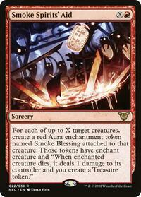 For each of up to X target creatures, create a red Aura enchantment token named Smoke Blessing attached to that creature. Those tokens have enchant creature and "When enchanted creature dies, it deals 1 damage to its controller and you create a Treasure token."