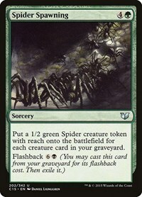 Put a 1/2 green Spider creature token with reach onto the battlefield for each creature card in your graveyard.