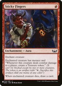 Enchanted creature has menace and "Whenever this creature deals combat damage to a player, create a Treasure token." (It can't be blocked except by two or more creatures. The token is an artifact with "T, Sacrifice this artifact: Add one mana of any color.")