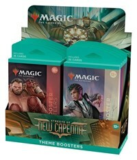 The Streets of New Capenna Theme Booster Display contains 10 Streets of New Capenna Theme Boosters, with 2 for each crime family: The Obscura (White-Blue-Black), The Maestros (Blue-Black-Red), The Riveteers (Black-Red-Green), The Cabaretti (Red-Green-White), and The Brokers (Green-White-Blue).